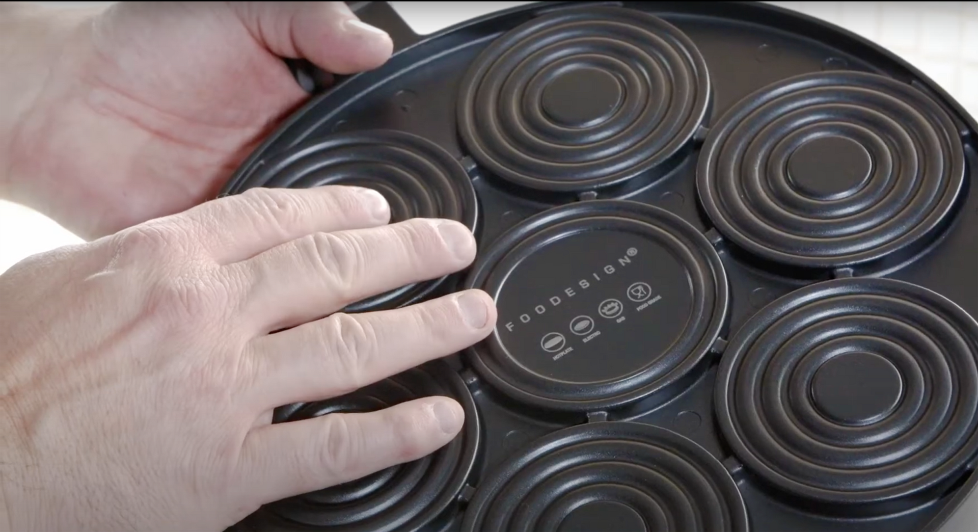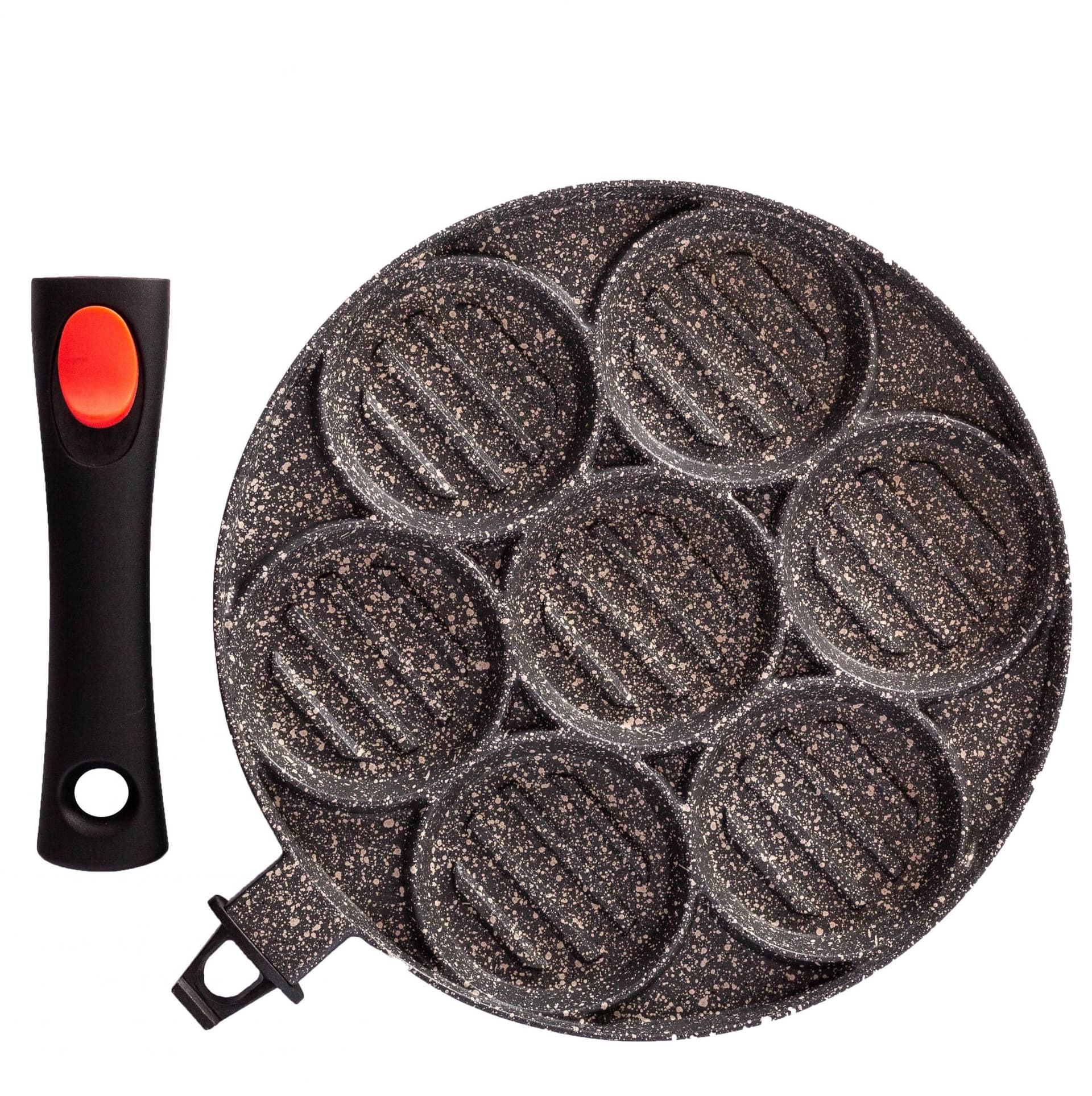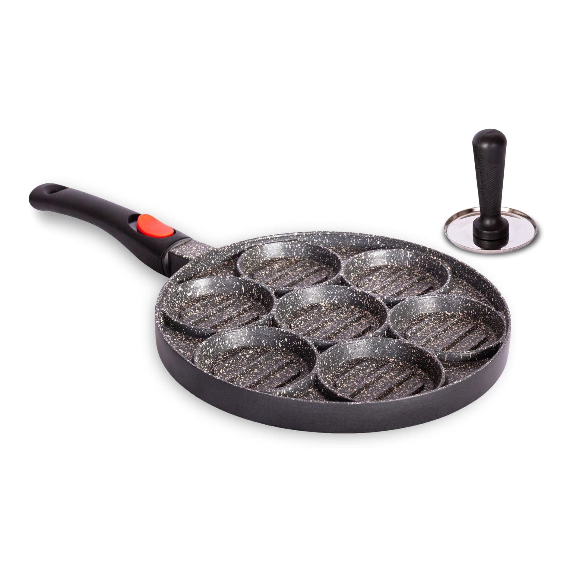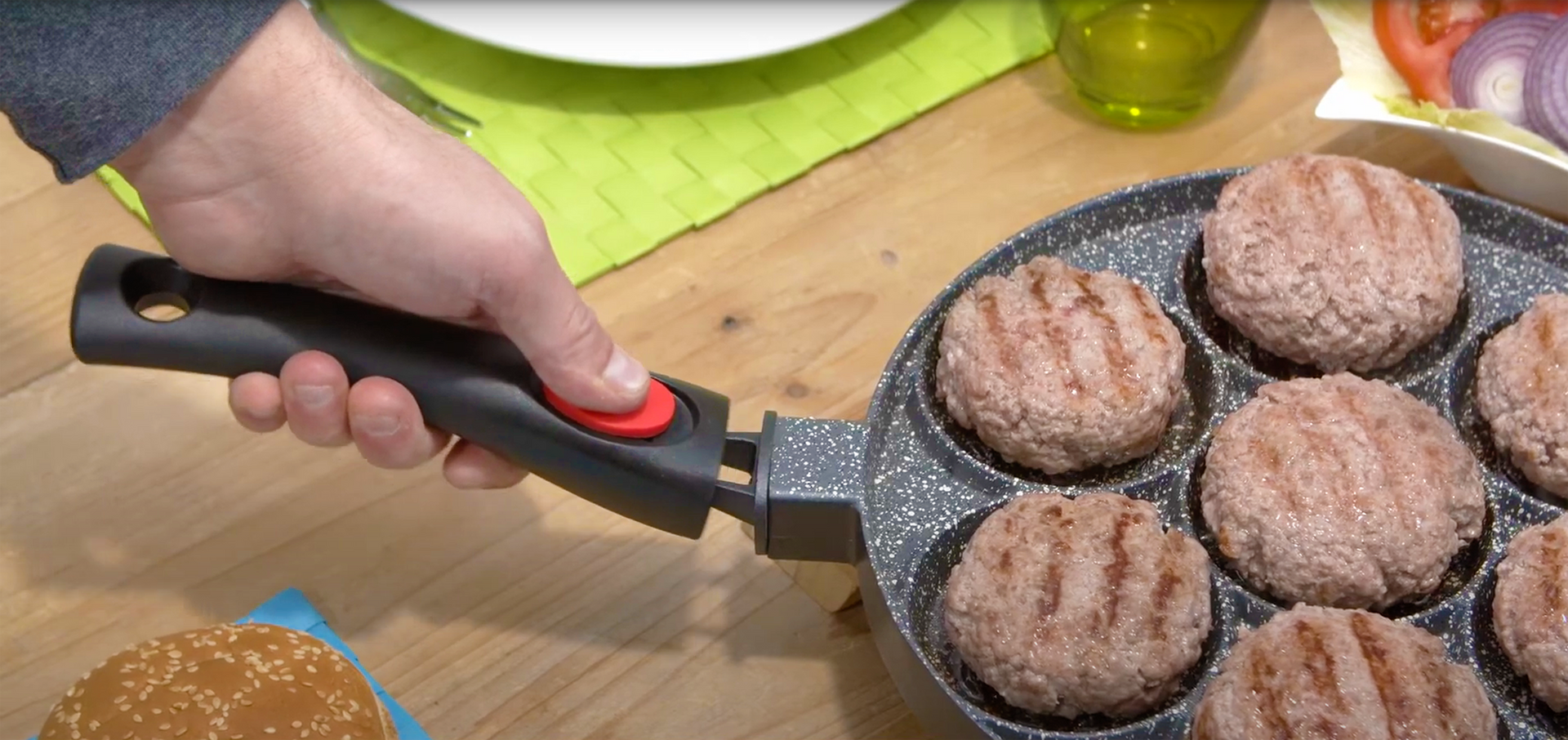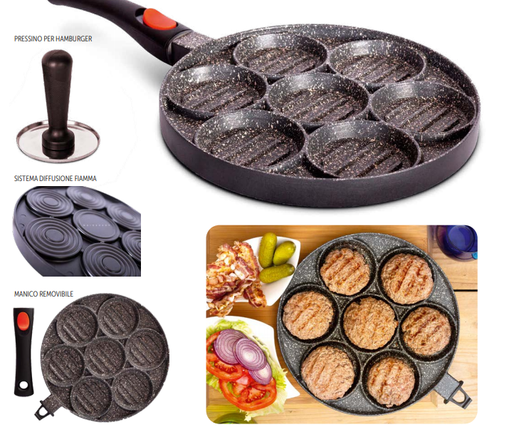 - AREA COTTURA DIA 8 CM PER CIASCUNA DELLE 7 CAVE, MANICO REMOVIBILE CON PULSANTE IN BACHELITE, STAMPO PER HAMBURGER IN ACCIAIO INOX