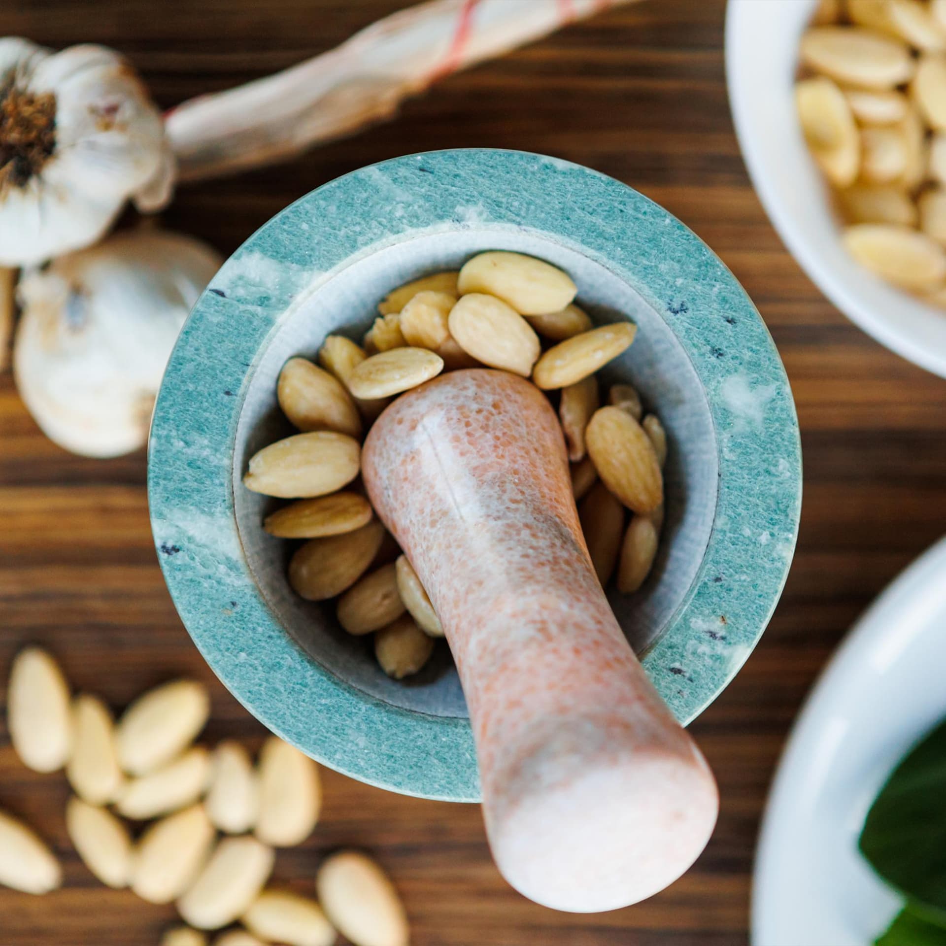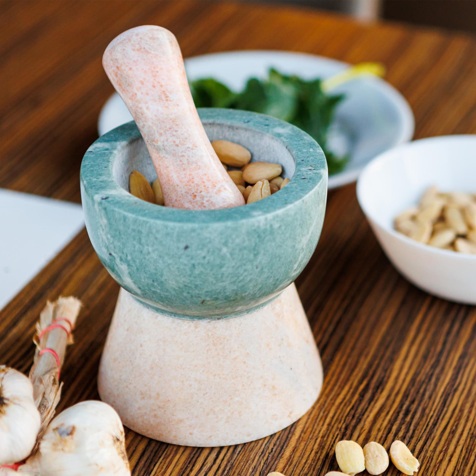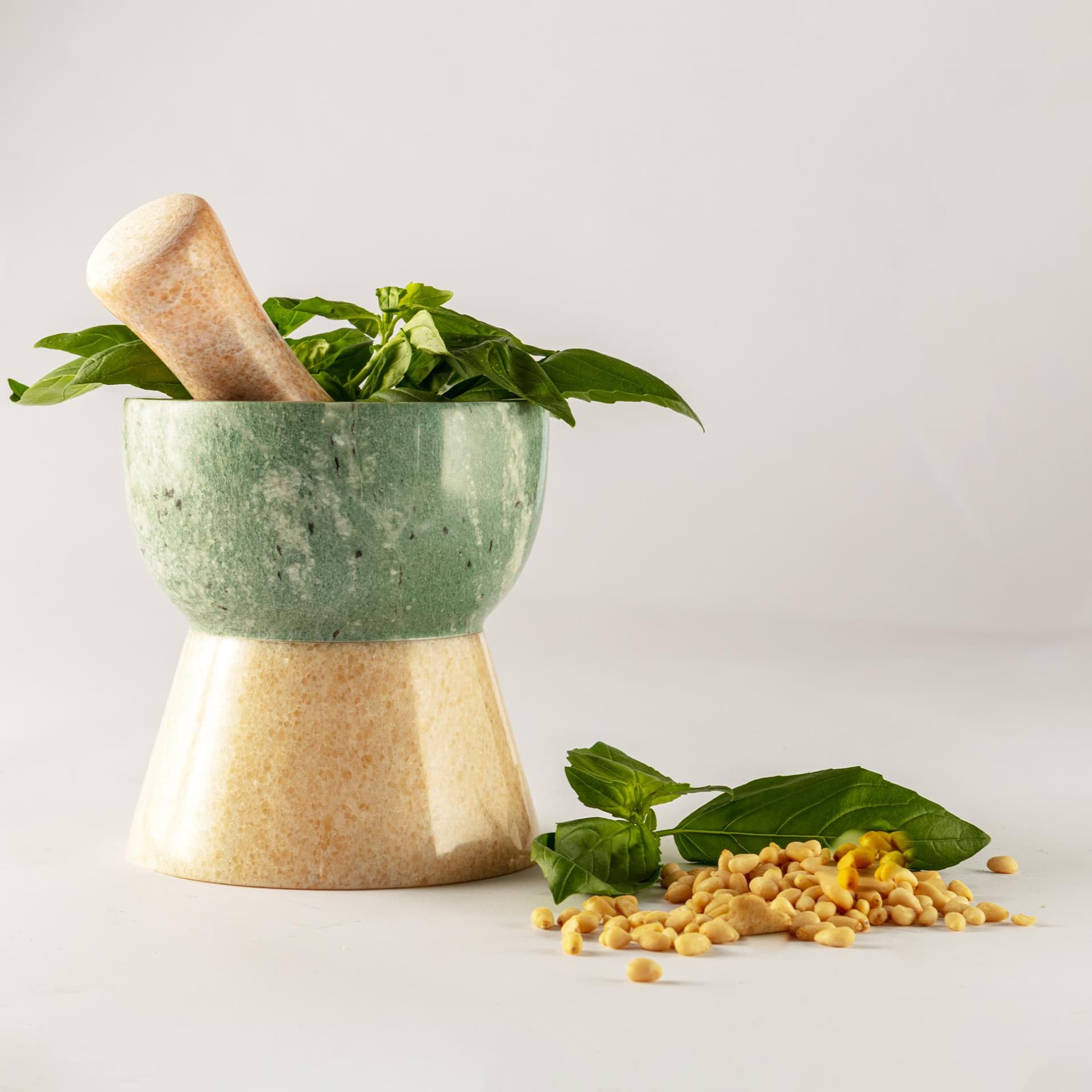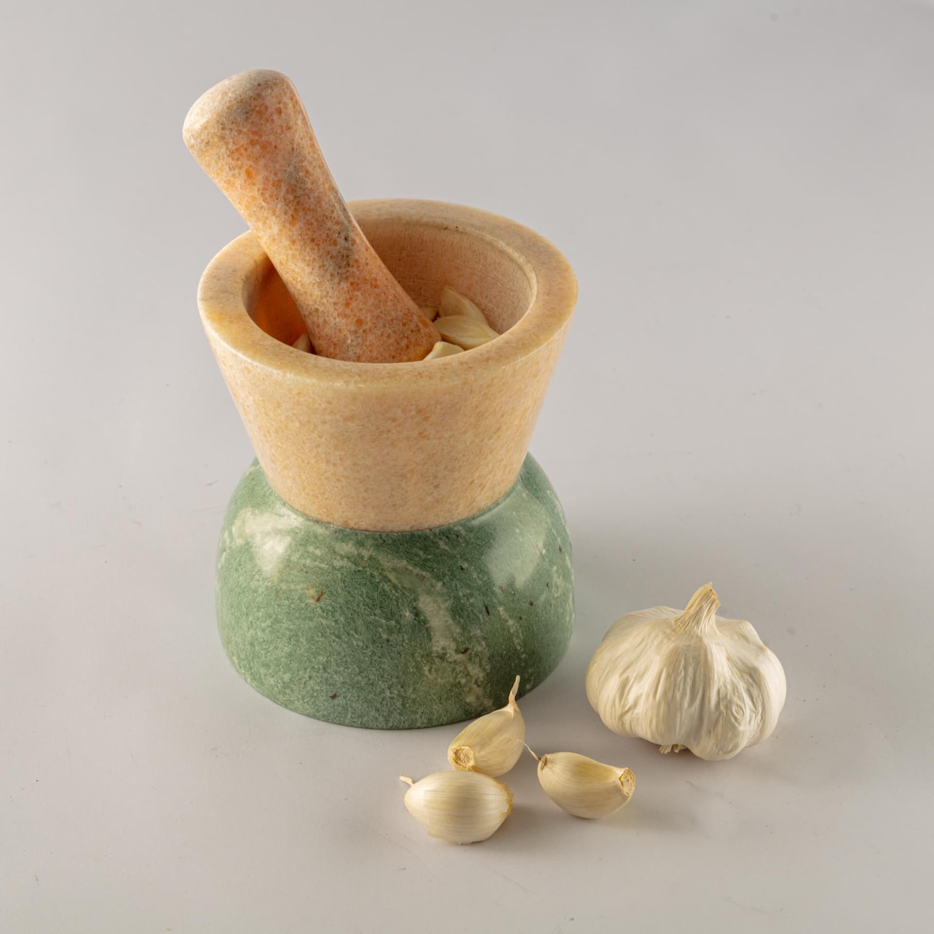 Il mortaio Giano è realizzato in marmo naturale rosa e verde, con doppia cava, per poter pestare aglio e spezie da un lato e menta ed erbe in generale dall'altro lato, senza contaminazioni di sapori.